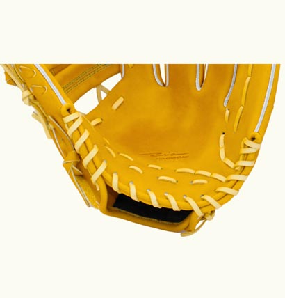 やや薬指下が広い十河モデルと比べ親指芯の幅が太く、やや親指が立った縦型形状のグラブ