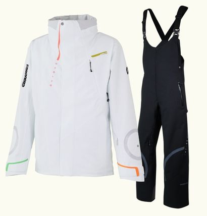 滑走時の動きを強調する腕部分のプリントが着用する方の滑りをより引き立てるデザインが特徴のジャケットにサイドファスナー付きのビブパンツのセット