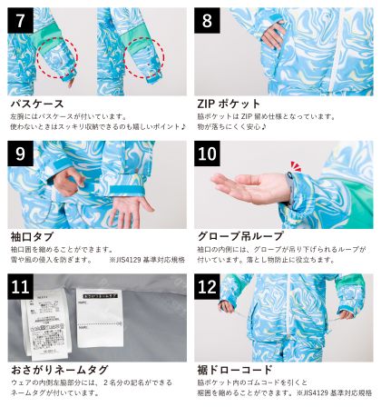 ・左袖パスケース:リフト券をそのまま入れられる。使わないときは袖内側に収納可能