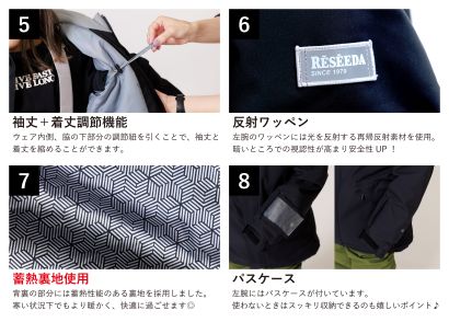 ・サイズ調整機能:袖丈と着丈の調整可能。ストッパー付きなのでらくちん調整