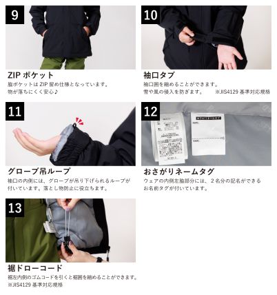 ・左袖パスケース:リフト券をそのまま入れられる。使わないときは袖内側に収納可能