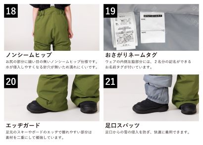 ・足口スパッツ:足口にインナースパッツあり。雪の浸入を防ぎます。
