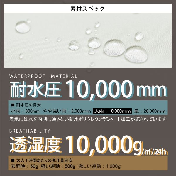 ・耐水圧10,000mm、透湿10,000g/m2/24h